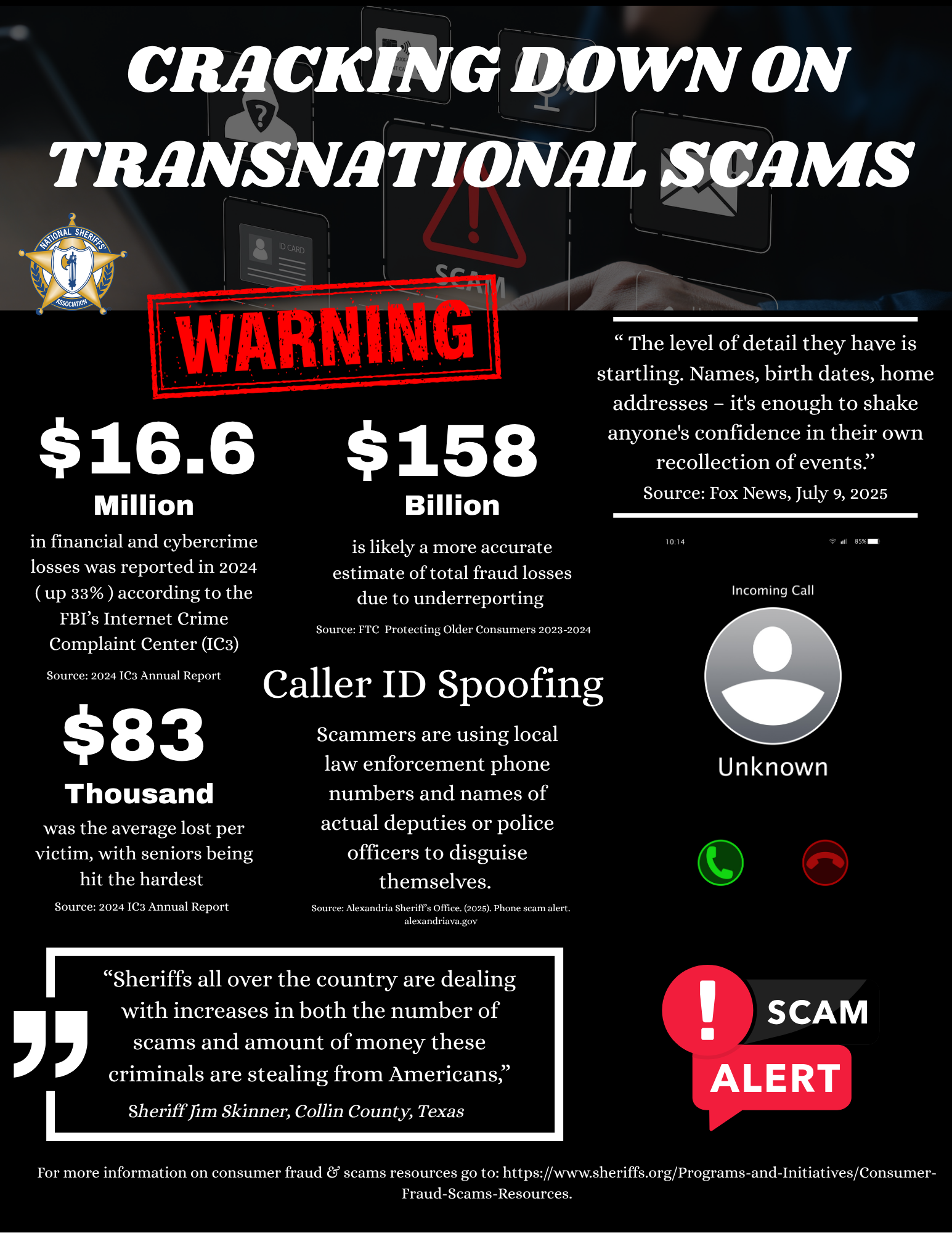 “As sheriffs, our job is not only to enforce the law but, ideally, to deter and prevent crime before it happens. One of the best ways that we can do that is through education. We need to educate the people we serve. While financial institutions generally have good warning systems in place, sometimes people do not heed these warnings… Sometimes people need to hear warnings from law enforcement directly. That is why it is incumbent on us to use our platforms to warn people about this very real threat.”